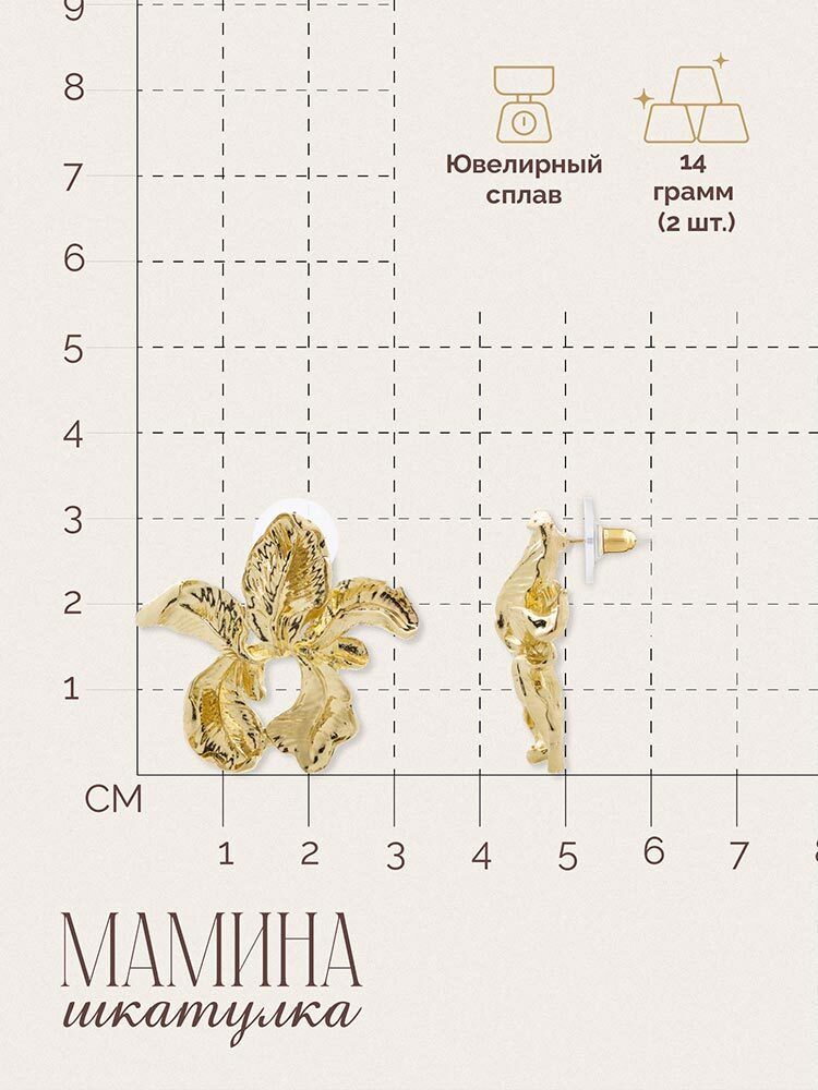 Серьги «Ирисы» — это великолепное украшение, которое олицетворяет бесконечную красоту и гармонию. Их изящный дизайн в форме цветков ириса и золотистый блеск привлекают внимание и покоряют сердца. Эти серьги станут символом вашей уникальной красоты, добавив в ваш образ утончённости и элегантности. Сделайте «Ирисы» частью своего стиля и дарите миру свою неповторимую привлекательность. «Мамина шкатулка» — бренд, воплощающий оригинальные идеи в мире украшений. В коллекции представлены изделия, созданные талантливыми дизайнерами со всего мира. Забота о клиенте — наш приоритет, поэтому мы предлагаем расширенную гарантию, услуги по ремонту и замене украшений. Ассортимент постоянно обновляется, чтобы вдохновлять и радовать тех, кто ищет стильные и необычные аксессуары. Винтажные, минималистичные и богемные модели приходят в элегантной упаковке, что делает их прекрасным выбором как для себя, так и для подарка.